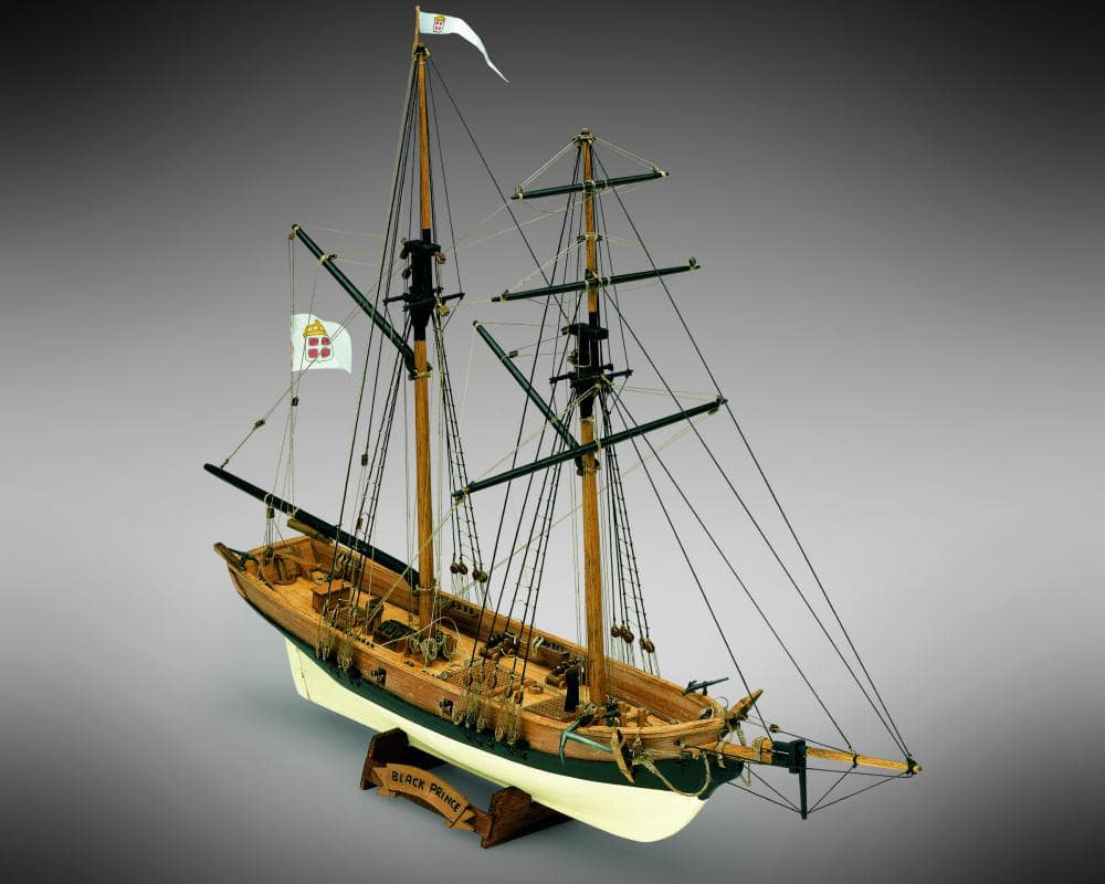 Black Prince Privateer Schooner 1775 Model Ship Kit er fremstillet af Mamoli Model Ship Kits & Mamoli Model Boat Kits. Mamoli fokuserer på historisk nøjagtighed og skalatrofasthed. Mamoli træmodelskibssæt tilbyder et stort udvalg af emner, der kan tilfredsstille næsten alle. Materialerne, der bruges i deres træmodelskibssæt, er altid førsteklasses, og planerne er meget detaljerede. BLACK PRINCE – Privateer schooner 1775 er et færdighedsniveau 2, hvilket gør det nemt at bygge for alle modelskibsentusiaster.