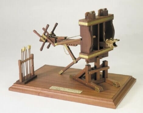 Este modelo de catapulta está construido a partir de un dibujo bizantino original del siglo X. Las fortalezas disparaban flechas con una precisión aceptable y una eficacia excelente.