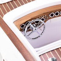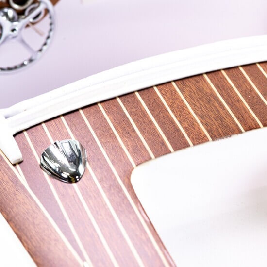 Il kit del motoscafo Bellezza contiene sedili in pelle simulata, cabina di pilotaggio in legno tagliato al laser con volante, accessori cromati e istruzioni di montaggio. Nota: lo zoccolo in legno non è incluso.
