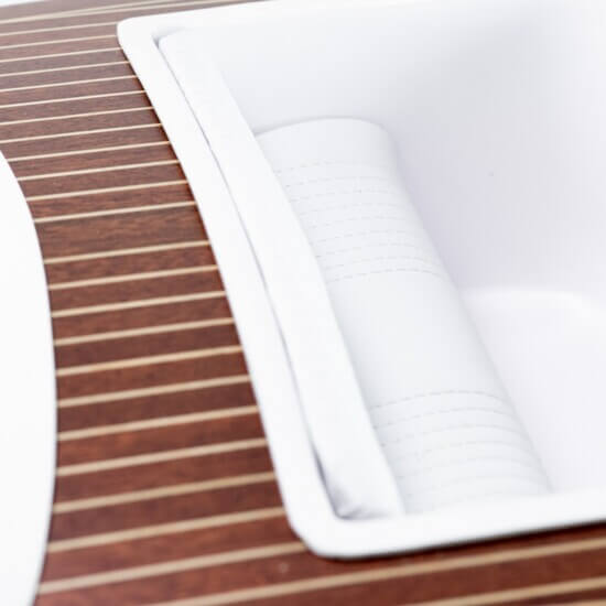 Scafo in vetroresina precostruito con coperta in legno. Adatto per radiocomando e motore elettrico.