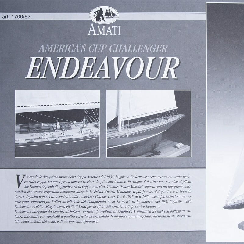 スクーナー・エンデバー号はアメリカズカップに挑み、最初の2レースで優勝した。第3レガッタは最もエキサイティングなレースになるはずだった。運命はトーマス・ソッピース卿に不親切な策略を弄した。モデルキットには、プランク・オン・バルクヘッド構造、レーザーカットされた木製甲板と板張り、真鍮と木製の付属品、エッチングされた真鍮のディテール、布製帆、設計図と詳細な説明書が含まれています。