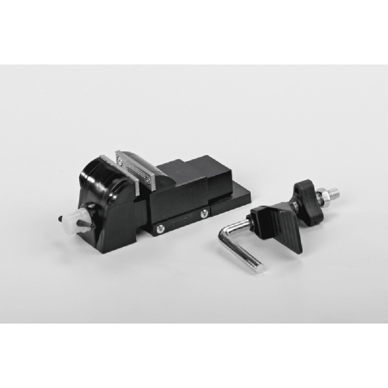Small nylon bench vise with metal jaws for holding small items easily.