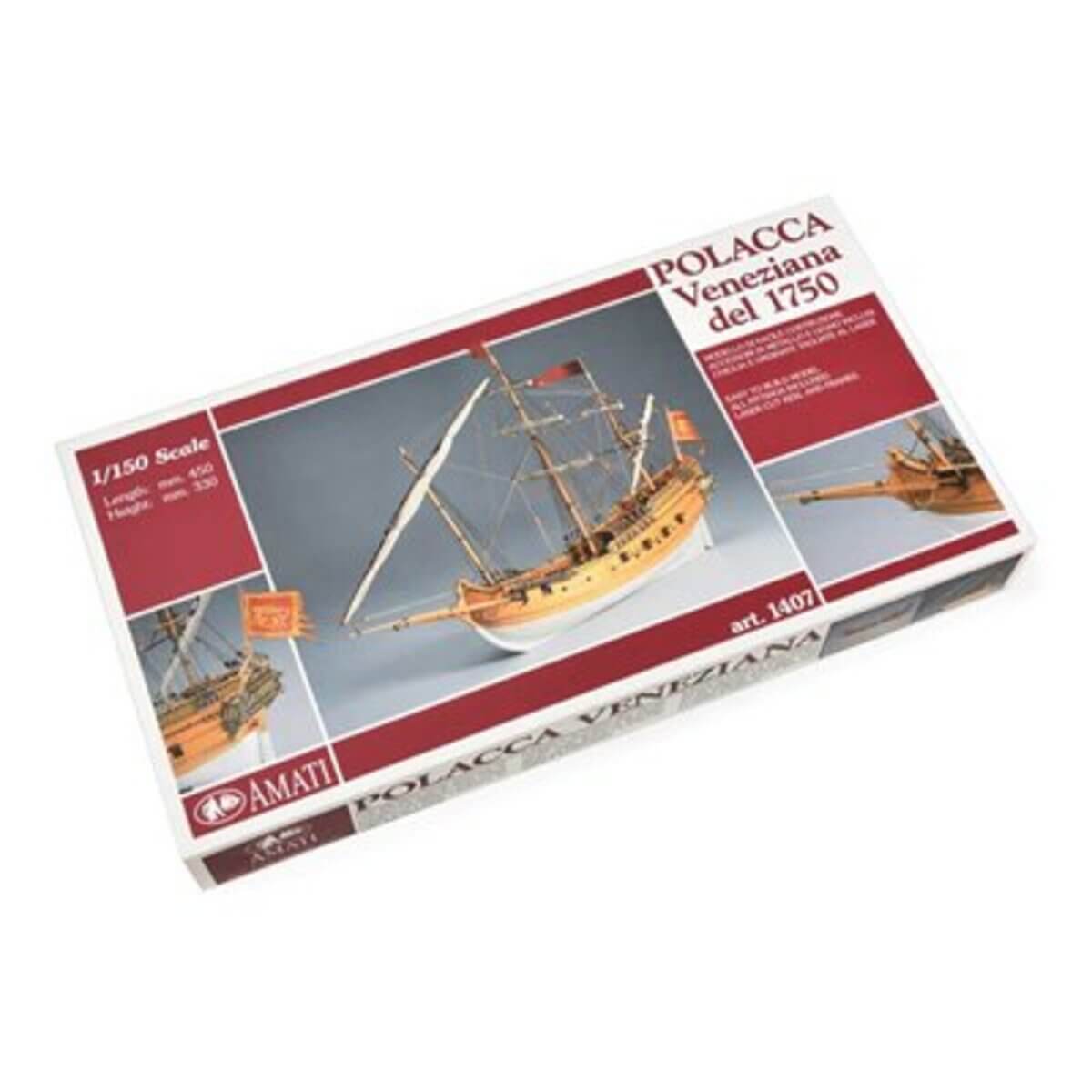 Polacca Venetian Cargo 1750 modellskipsett er en trofast tolkning av det originale fartøyet. Alt materiale er av det beste som er tilgjengelig, og planer og instruksjoner er alltid utmerket og lett å følge. Amati Ship Models har integrert datamaskindesign og de nyeste materialene for å produsere skipsmodellsett av høy kvalitet.